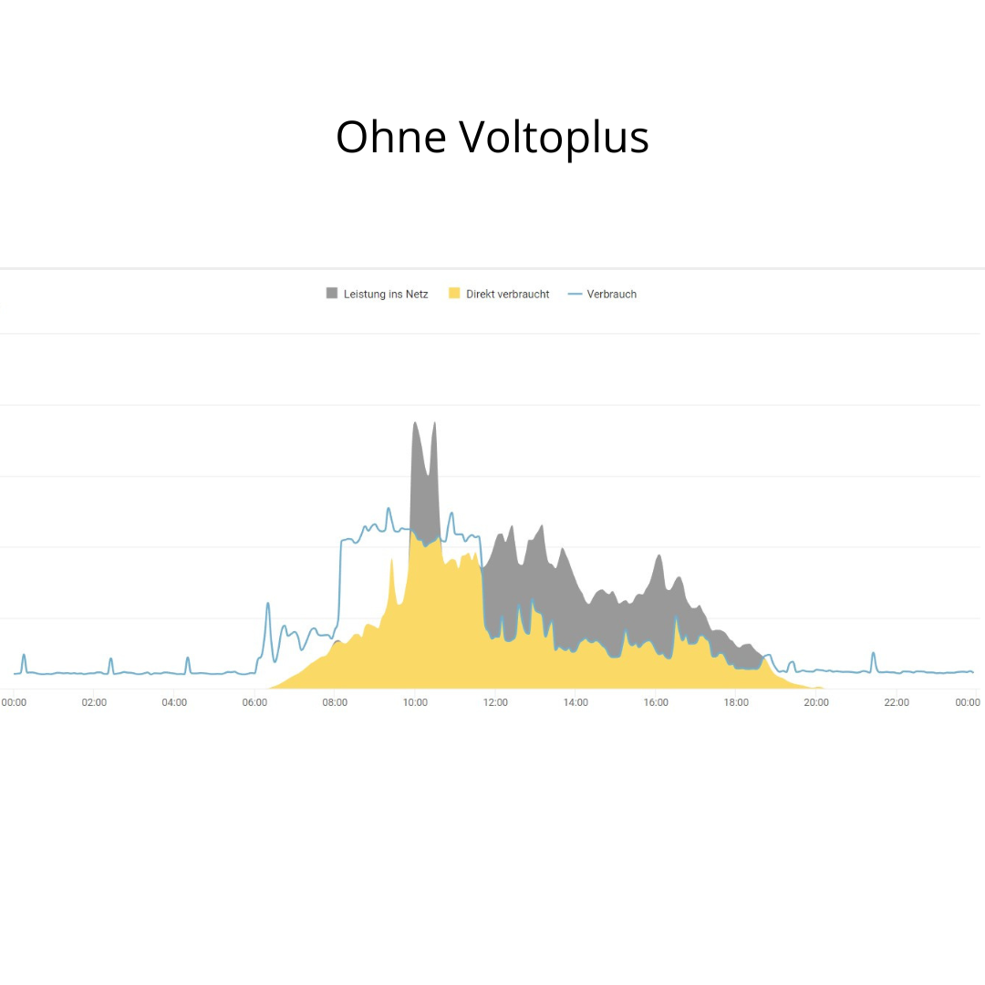An den folgenden drei Grafiken ist zu sehen, wie es in der Praxis mit und ohne dem Einsatz von Voltoplus ausschaut. Im direktem Vergleich ist sehr gut ersichtlich, wie eine perfekte Eigenstromnutzung dank Voltoplus möglich ist. Der überschüssige Strom aus der PV-Anlage kann dabei nicht nur zum Laden von Elektrofahrzeugen genutzt werden, sondern beispielsweise auch zum Aufheizen eines Boilers.